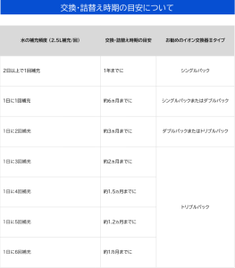 どんな高性能なイオン交換器やろ過カートリッジでも、 メーカーが推奨する期間 での定期的な交換は欠かせません。