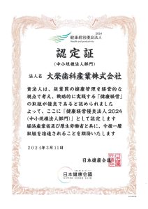 「健康経営優良法人2024」に認定されました 2024.03.13 お知らせ 2024年3月11日付で、経済産業省と日本健康会議が共同で実施する「健康経営優良法人2024(中小規模法人部門)」に 認定されましたのでお知らせいたします。昨年に引き続き2年連続での認定となります。 ■健康経営優良法人とは 健康経営優良法人認定制度とは、地域の健康課題に即した取組や日本健康会議が進める健康増進の取組をもとに、 特に優良な健康経営を実践している大企業や中小企業等の法人を顕彰する制度です。 当社は、今後も健康経営を推進し、従業員の健康と働きやすい職場環境づくりに取り組んでまいります。