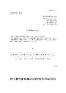 冬季休業のお知らせ 2024.12.03 お知らせ 平素より格別のお引き立てを賜り、厚く御礼申し上げます。 さて、誠に勝手ながら弊社では、下記期間を冬季休業とさせていただきます。 休業期間中、お客様には何かとご不便、ご迷惑をおかけいたしますが、何卒ご了承賜りますようお願い申し上げます。 休業期間:2024年12月28日(土)~2025年1月5日(日) ※2025年1月6日(月)午前9時より通常通り営業いたします。